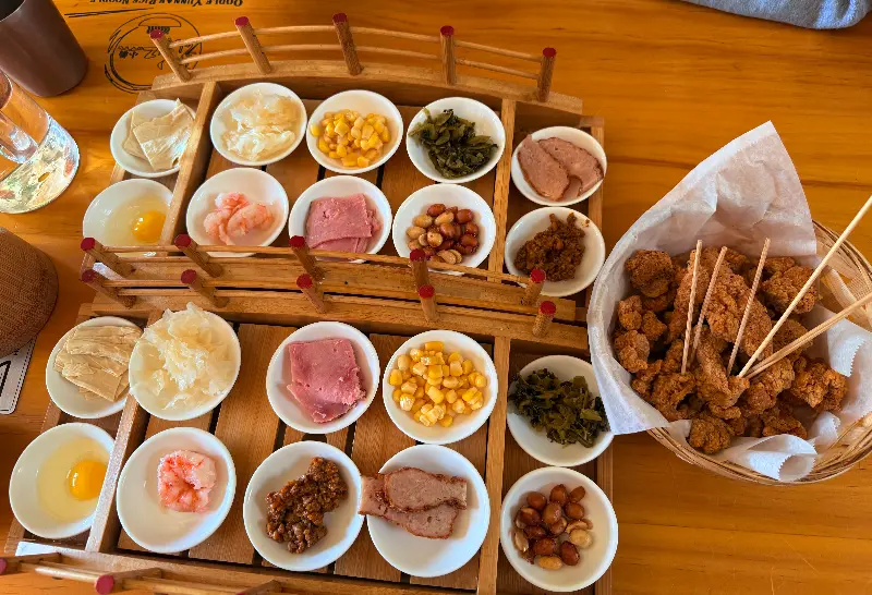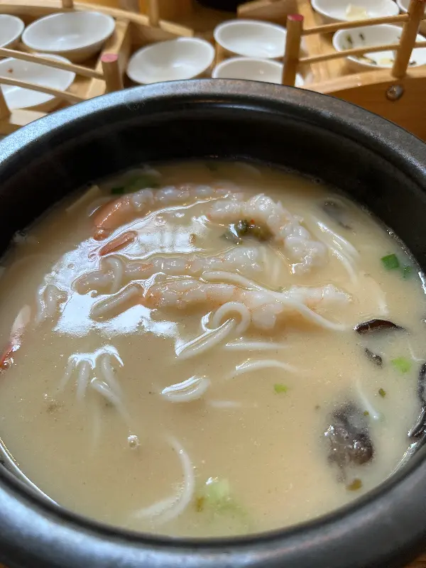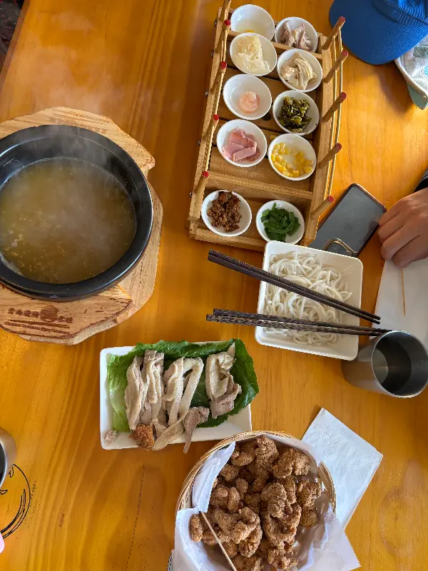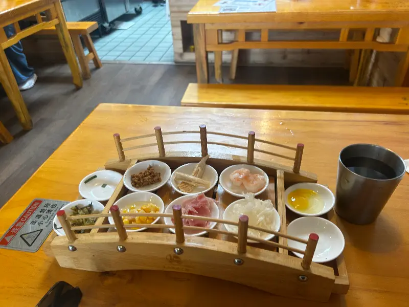 드디어 기다리고 기다리던 크로싱 브릿지 누들이 나왔다. 나무 다리 모양의 독특한 트레이에 다양한 토핑들이 담겨 나왔는데, 그 모습이 마치 예술 작품 같았다. 얇게 썰린 고기, 신선한 해산물, 아삭한 채소 등 알록달록한 색감 덕분에 눈으로도 즐거움을 느낄 수 있었다.