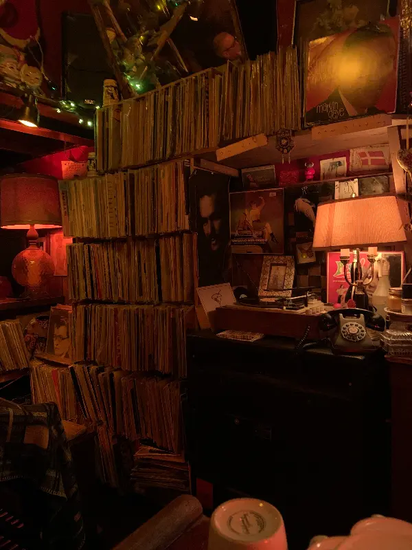 LP판이 가득한 벽면은 로얄 쿠쿠의 음악적 정체성을 보여준다. 오래된 레코드판에서 흘러나오는 음악은 아날로그 감성을 자극한다.
