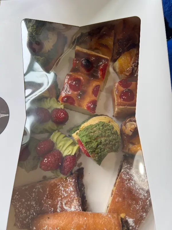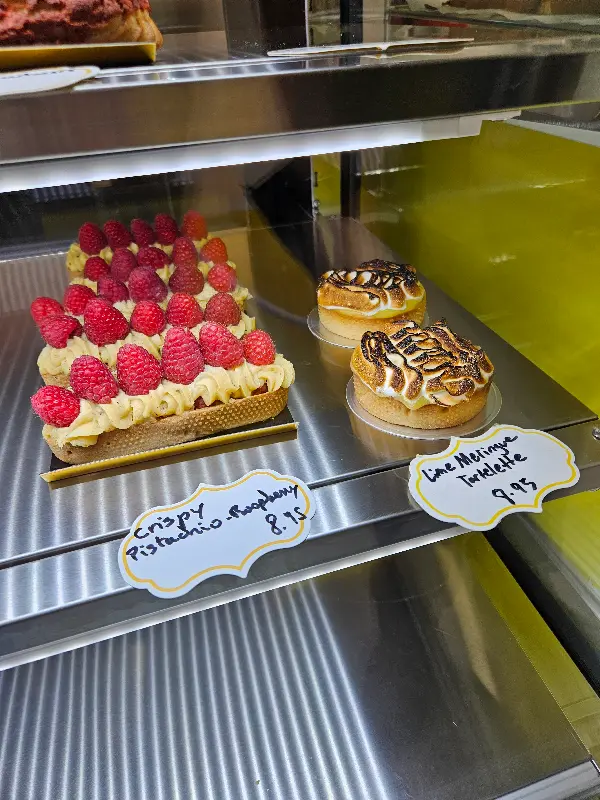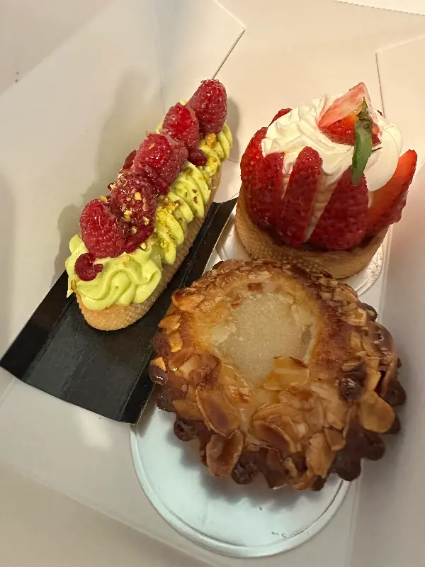 친구들과 함께 KC Paris에서 다양한 디저트를 맛보았습니다. 사장님께서는 저희가 여러 종류를 맛볼 수 있도록 친절하게 잘라주셨습니다. 믹스 과일 타르트, 피스타치오 라즈베리 에클레어 등 모든 디저트가 훌륭했지만, 그중에서도 피스타치오 브레스트는 단연 최고였습니다. 고소한 피스타치오 크림과 바삭한 페이스트리의 조화는 잊을 수 없는 맛이었습니다.