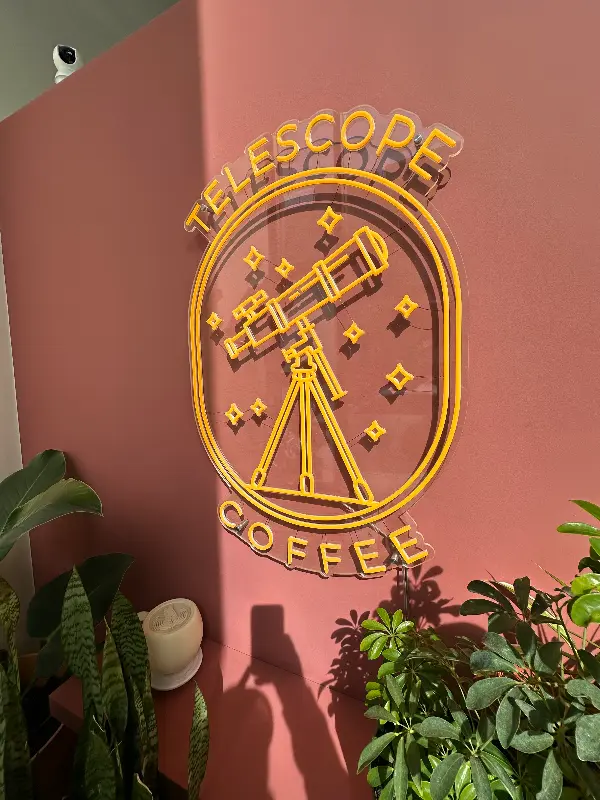 Telescope Coffee라는 이름에 걸맞게, 카페 곳곳에는 망원경을 연상시키는 오브제들이 놓여 있었다. 특히 눈길을 사로잡는 것은 벽면에 걸린 네온사인 간판이었다. 노란색 빛을 내는 망원경 그림은 마치 밤하늘의 별을 향해 뻗어 나가는 듯한 역동적인 느낌을 주었고, Telescope Coffee만의 특별한 분위기를 더욱 강조하는 듯했다.