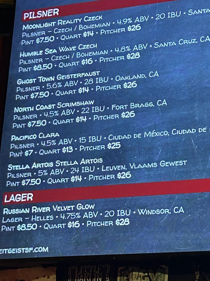 Zeitgeist의 심장은 단연 바에 있었습니다. 길게 늘어선 탭에서 뿜어져 나오는 맥주는 그 종류만 해도 헤아릴 수 없을 정도로 다양했습니다. 생맥주 종류가 정말 많다는 리뷰처럼, 필스너, 라거 등 다채로운 지역 맥주와 해외 맥주들이 손님들을 유혹하고 있었죠. 디지털 메뉴판에는 각 맥주의 ABV(알코올 도수)와 IBU(쓴맛 단위)까지 상세히 표기되어 있어, 맥주 애호가라면 누구나 자신에게 맞는 완벽한 한 잔을 찾을 수 있을 것 같았습니다. 마치 작은 맥주 박물관에 온 듯, 샌프란시스코의 훌륭한 맥주들을 한자리에서 만끽할 수 있는 곳이었습니다.