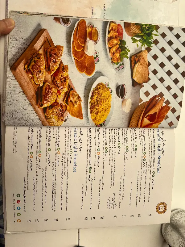 메뉴를 펼쳐 들고 고민에 빠졌다. 다양한 아라비안 음식들 앞에서 무엇을 골라야 할지 망설여졌기 때문이다. 결국, 가장 인기 있다는 ‘Emirati Breakfast Trays’를 선택했다. 2인 기준으로 제공되는 메뉴였지만, 혼자서 도전해보기로 했다.
