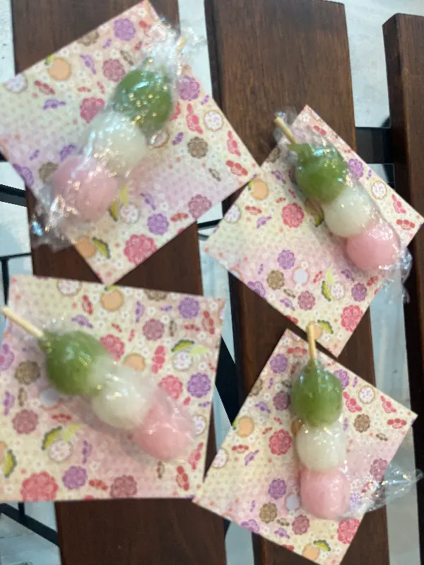 다시 봐도 먹음직스러운 경단 꼬치. 세 가지 색깔이 조화롭게 어우러진다.