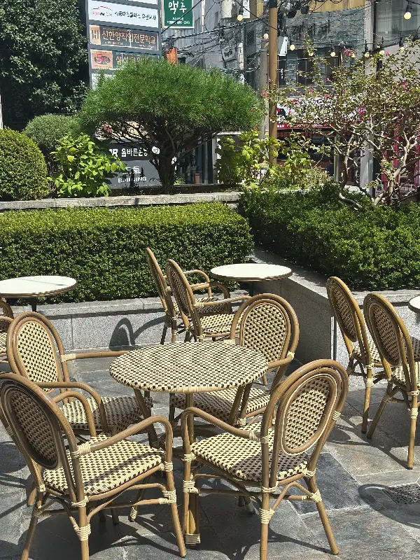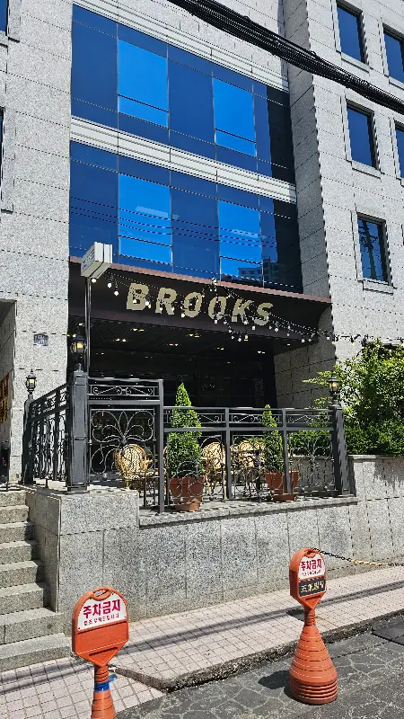 서면역에서 발걸음을 옮겨, 마치 보물찾기라도 하듯 골목길을 헤매다 발견한 브룩스5. 카페 입구에 다다르자, 세련된 외관과 아늑한 테라스 자리가 눈에 띄었습니다. 푸르른 잎사귀들이 드리워진 야외 테이블은 도심 속 작은 정원 같은 분위기를 자아냈죠. 마치 비밀스러운 아지트를 발견한 듯한 설렘을 안고 안으로 들어섰습니다.