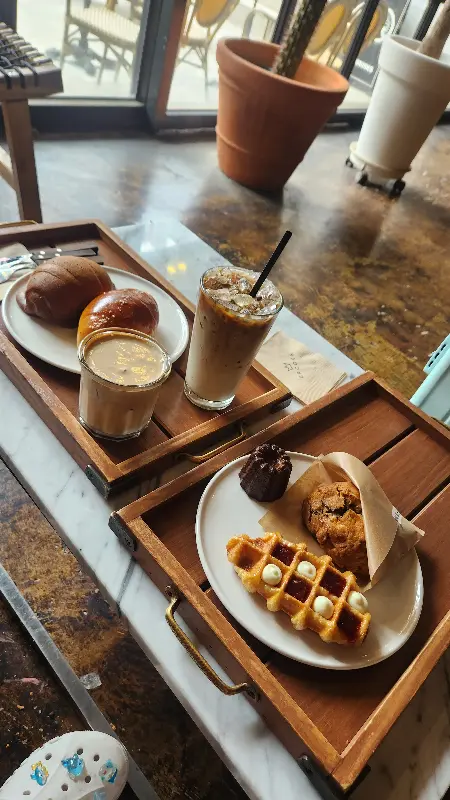 주문한 스패니쉬 라떼와 우유크림 도넛이 나왔습니다. 스패니쉬 라떼는 부드러운 우유와 에스프레소의 조화가 훌륭했고, 은은한 단맛이 기분 좋게 느껴졌습니다. 드디어 기대했던 우유크림 도넛을 맛볼 차례. 뽀얀 우유크림이 가득 찬 도넛을 한 입 베어 무는 순간, 입안 가득 달콤함이 퍼져 나갔습니다. 부드러운 크림과 빵의 조화는 환상적이었고, 느끼함 없이 깔끔한 맛이었습니다. 크로플은 눅눅했다는 평도 있지만, 제가 맛본 도넛은 정말 훌륭했습니다.