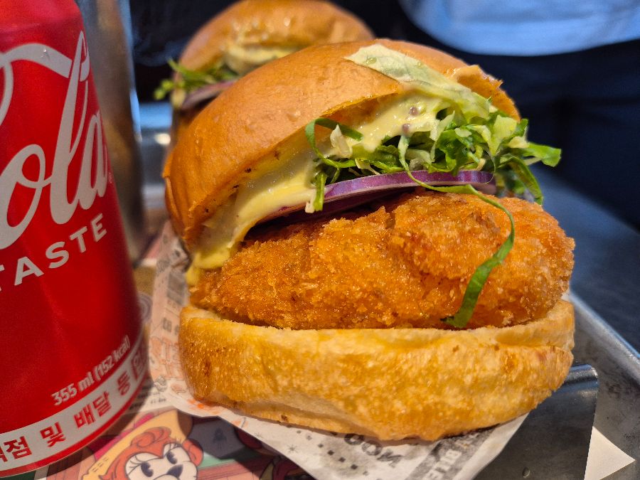 한 입 베어 무는 순간, 입안 가득 퍼지는 새우의 풍미! 탱글탱글한 새우살이 톡톡 터지는 식감이 환상적이었다. 최소 10마리는 들어간 듯한 푸짐한 새우 패티는 정말 존맛탱이었다. 빵은 부드럽고 촉촉했고, 신선한 채소는 아삭아삭 씹히는 맛이 좋았다.