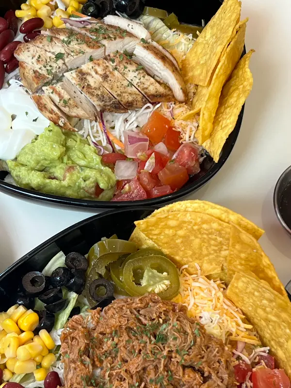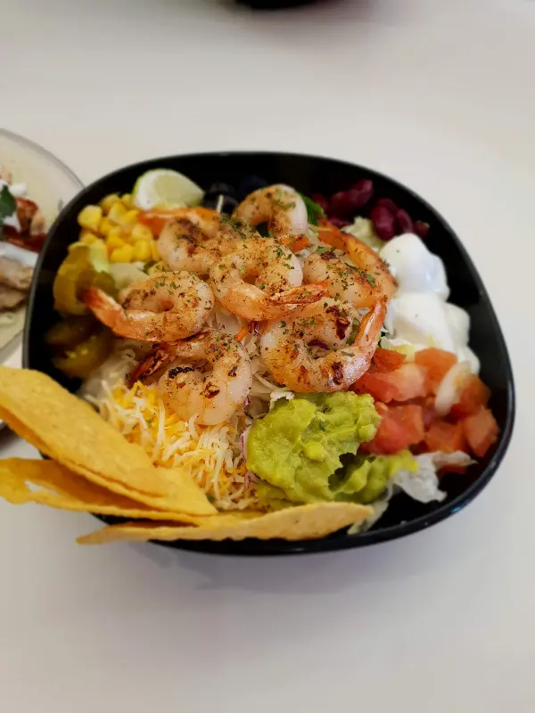 메뉴판을 펼쳐 들고 고민 끝에 샐러드 볼과 새우 타코를 주문했습니다. 잠시 후, 눈앞에 펼쳐진 샐러드 볼은 그야말로 ‘알찬’이라는 단어 그 자체였어요. 신선한 야채는 기본, 닭가슴살, 풀드포크, 새우, 옥수수, 블랙 올리브, 강낭콩, 나쵸칩, 아보카도 과카몰리 등 다채로운 토핑이 흑색 볼 가득 담겨 있었습니다. 샐러드 위에는 잘 구워진 닭가슴살이 가지런히 놓여 있었는데, 겉은 살짝 바삭하고 속은 촉촉한 완벽한 조리 상태를 자랑했습니다.