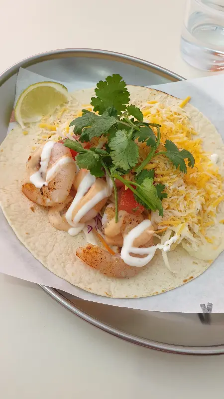 샐러드 볼에 감탄하고 있을 때, 곧이어 새우 타코가 나왔습니다. 또띠아 위에 탱글탱글한 새우와 신선한 야채, 치즈, 그리고 특제 소스가 듬뿍 올려져 있었어요. 한 입 베어 무니, 입안 가득 퍼지는 새우의 풍미와 아삭아삭한 야채의 식감이 환상적인 조화를 이루었습니다. 특히, 타코 위에 뿌려진 소스는 매콤하면서도 달콤한 맛이 어우러져, 새우 타코의 맛을 한층 더 끌어올리는 역할을 했습니다. 라임 한 조각을 살짝 짜서 먹으니, 상큼함까지 더해져 더욱 풍성한 맛을 느낄 수 있었죠.