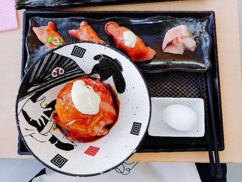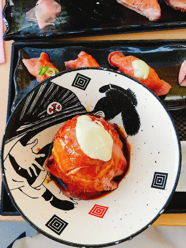 고민 끝에 고기 덮밥과 고기 초밥을 주문했습니다. 윤기가 자르르 흐르는 밥 위에 얹어진 고기는 보기만 해도 군침이 돌았습니다. 한 입 베어 무는 순간, 입 안 가득 퍼지는 고소한 육즙과 짭짤하면서도 달콤한 소스의 조화는 그야말로 환상적이었습니다. 밥알 하나하나에 스며든 풍미 덕분에 쉴 새 없이 젓가락을 움직였습니다.