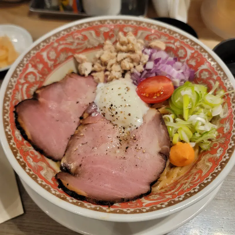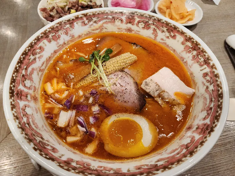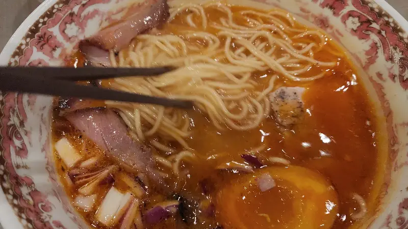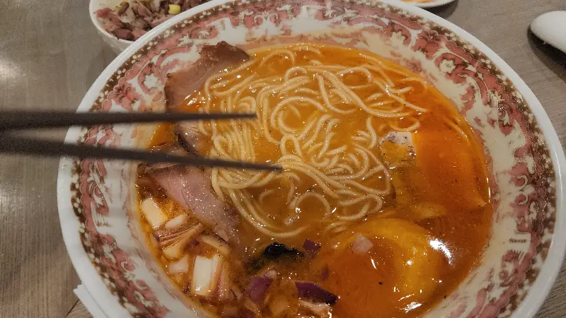 토핑으로는 부드러운 차슈, 촉촉한 반숙 계란, 아삭한 적양파 등이 푸짐하게 올라가 있었다. 특히 차슈는 수비드 조리 후 토치로 살짝 구워, 겉은 쫄깃하고 속은 촉촉한 완벽한 식감을 자랑했다. 돼지 특유의 잡내는 전혀 느껴지지 않았고, 은은한 불향이 미소라멘의 풍미를 한층 더 끌어올렸다. 반숙 계란은 노른자가 흘러내리면서 국물과 어우러져 더욱 깊고 부드러운 맛을 선사했다.