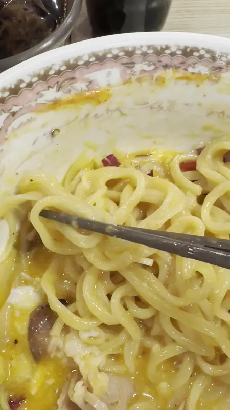 국물부터 한 입 맛보았다. 걸쭉하면서도 깊은 감칠맛이 입안 가득 퍼져 나갔다. 일본식 미소 특유의 고소함과 은은한 매콤함이 완벽한 조화를 이루며, 짜지 않고 적당히 진한 국물은 정말 일품이었다. 삿포로 미소라멘 계열과 비슷하다는 평처럼, 묵직하면서도 깊이 있는 맛이 인상적이었다.