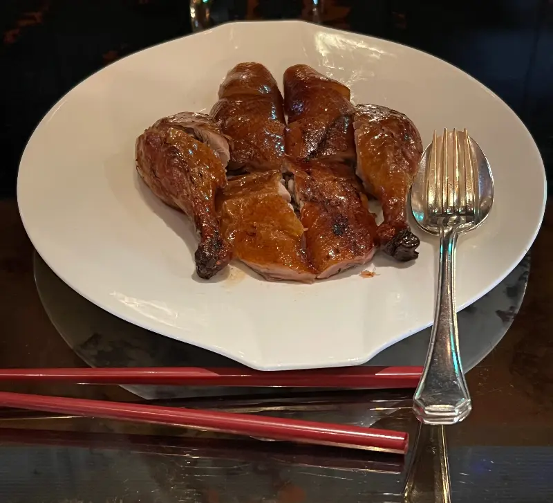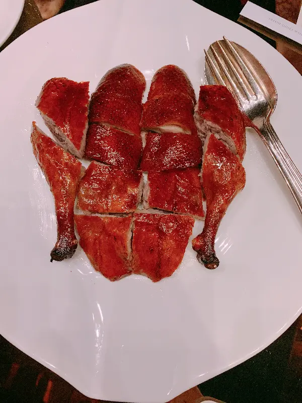 르 팔레의 시그니처 메뉴인 베이징덕은 3일 전에 예약해야만 맛볼 수 있다고 합니다. 그만큼 정성이 가득 담긴 요리라는 것을 알 수 있었습니다. 드디어 테이블 위에 올려진 베이징덕의 모습은 정말 황홀했습니다. 짙은 갈색의 윤기가 흐르는 껍질은 바삭함을 넘어 마치 유리처럼 섬세하게 빛났습니다.