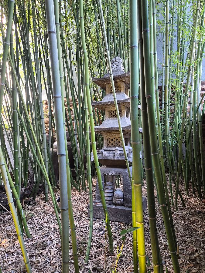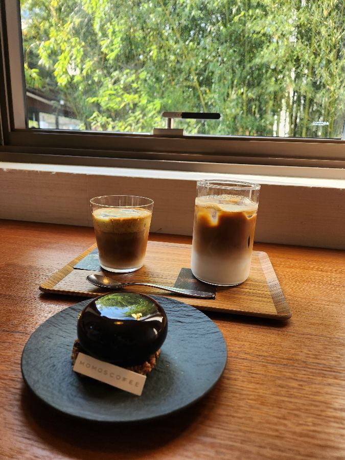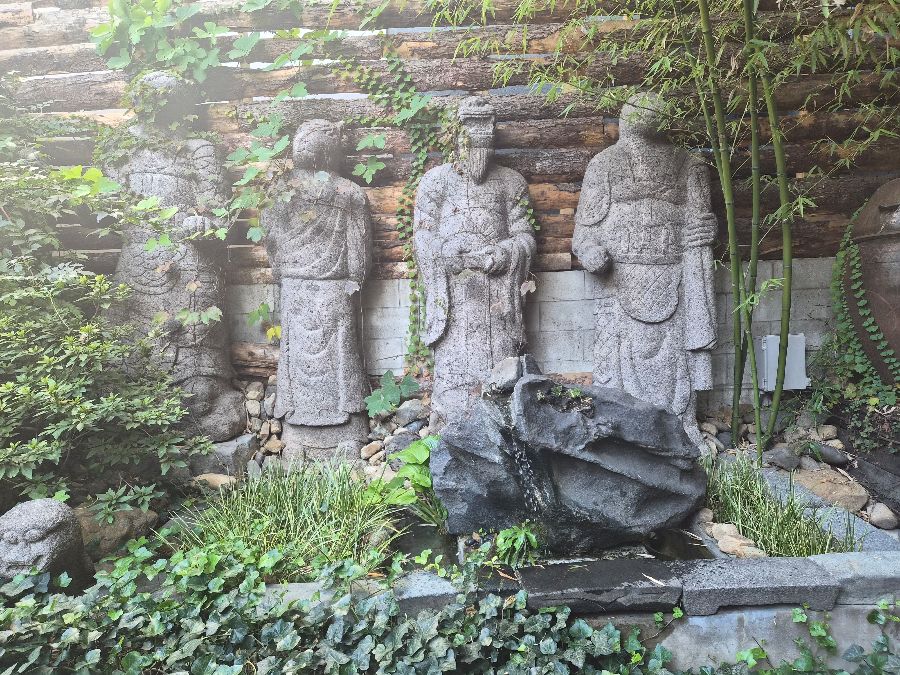 맛있는 커피와 빵을 즐긴 후, 카페의 자랑인 정원으로 발길을 옮겼습니다. 야외 테이블은 그 자체로 또 하나의 그림 같은 공간을 형성하고 있었습니다. 따스한 햇살 아래 녹음이 우거진 정원을 바라보며 앉으니, 도심 속이라는 사실을 잊을 만큼 평화로웠습니다. 잘 가꾸어진 대나무 숲길 사이로 바람이 스치는 소리가 귓가에 속삭이듯 들려왔고, 그 사이로 언뜻 보이는 석등과 석상들은 고즈넉한 분위기를 더했습니다.