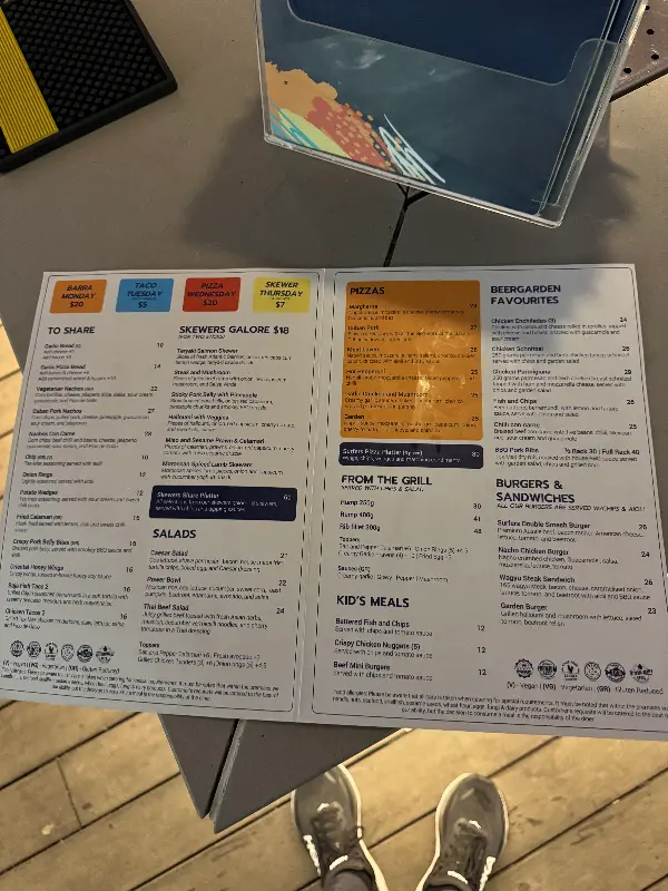 몇몇 리뷰에서 지적된 것처럼, 위생 상태는 개선이 필요해 보입니다. 바닥이 끈적거리고 테이블도 깨끗하지 않은 곳이 있었습니다. 실내에 있는 커다란 파라솔은 대형 스크린을 가리는 역할을 해서, 실용성이 떨어져 보였습니다. 하지만 이러한 단점에도 불구하고, 서퍼스 파라다이스 비어 가든은 매력적인 분위기와 맛있는 음식으로 충분히 방문할 가치가 있는 곳입니다.
