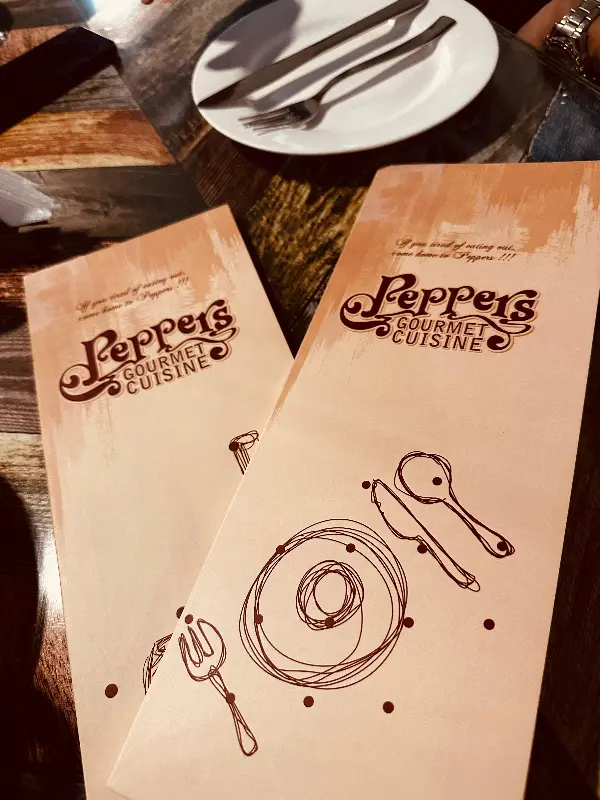 Peppers의 메뉴판, 다양한 요리와 음료가 미식가들의 선택을 기다린다.