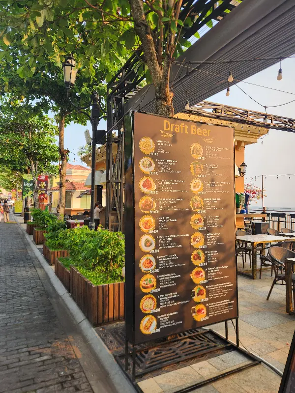 어스름한 저녁, 무이네 앞시장의 활기 넘치는 풍경을 뒤로하고 힐튼 라페스타에서 도보로 5분 거리에 위치한 한 레스토랑으로 향했다. 해 질 녘의 아름다운 풍경을 만끽할 수 있다는 정보를 입수, 설레는 마음을 안고 발걸음을 옮겼다. 길가에 세워진 메뉴판에는 다양한 드래프트 비어와 함께 먹음직스러운 음식 사진들이 시선을 사로잡았다.