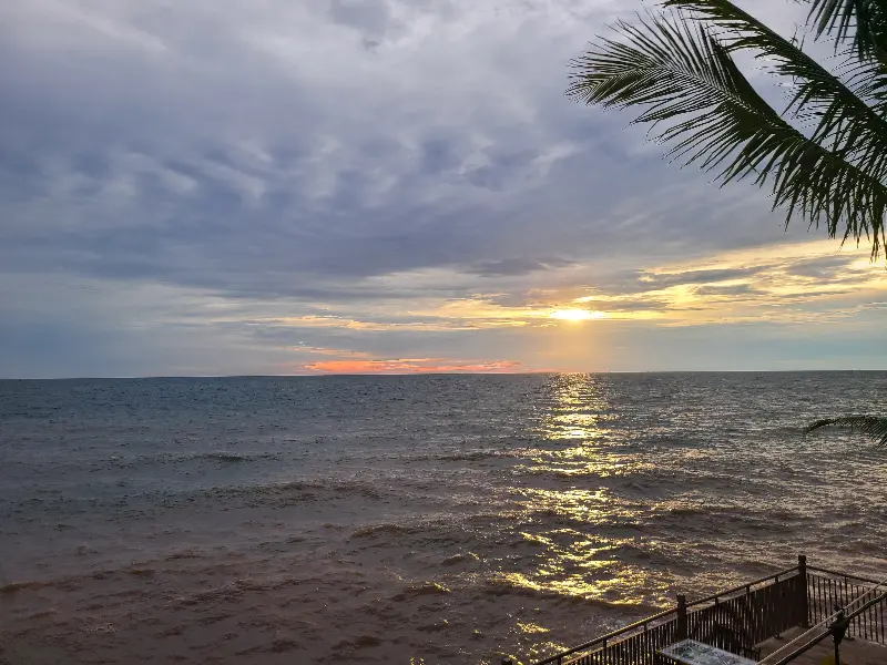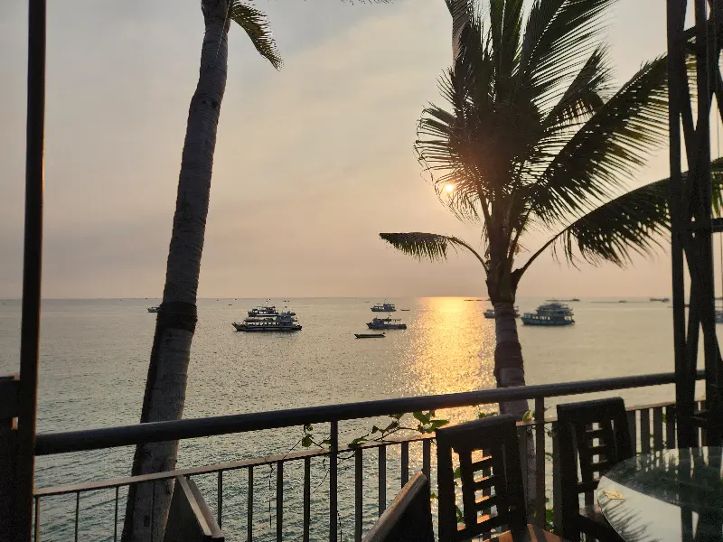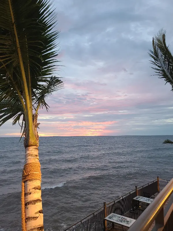 레스토랑에 들어서자, 탁 트인 바다 전망이 눈 앞에 펼쳐졌다. 짙푸른 바다 위로 붉게 물들어가는 하늘은 그야말로 장관이었다. 특히 야자수 나무 사이로 쏟아지는 햇살은 마치 한 폭의 그림 같았다. 석양을 배경으로 사진을 찍으니 그 어떤 필터도 필요 없는 인생샷을 건질 수 있었다. 6시 30분, 해가 가장 아름답게 지는 시간에 맞춰 방문한 것은 정말 최고의 선택이었다.