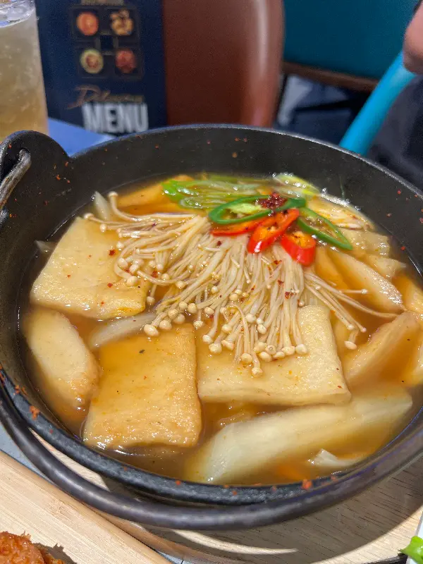 특히 인상적인 것은 오뎅탕입니다. “오뎅탕 시켰는데 생각보다 맛좋아서 놀람 ㅋ”이라는 리뷰처럼, 기대 이상의 맛을 자랑합니다. 뚝배기 안에서 보글보글 끓는 오뎅탕은 매콤하면서도 시원한 국물 맛이 일품입니다. 쫄깃한 오뎅과 함께 떠먹는 국물은, 쌀쌀한 날씨에 몸을 녹여주는 최고의 선택입니다. 이미지에서 보이는 팽이버섯과 고추의 조화는 시각적으로도 식욕을 자극합니다.