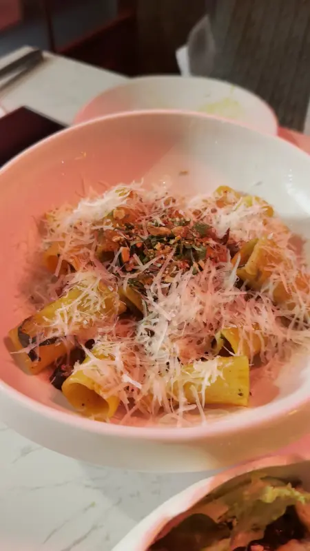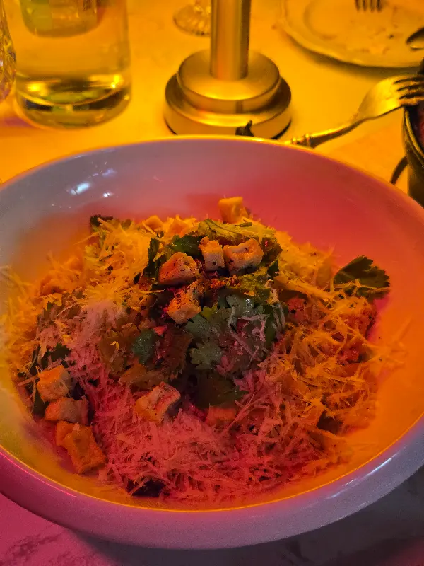 언니와 저는 다양한 메뉴를 맛보기로 했습니다. 먼저, 향긋한 트러플 향이 코를 간지럽히는 ‘트러플 오일 파스타’는 제가 먹어본 파스타 중 최고였습니다. 면발 하나하나에 소스가 깊숙이 배어 있어, 입안 가득 퍼지는 풍미가 일품입니다. 겉은 바삭하고 속은 촉촉한 ‘아스파라거스와 수란을 곁들인 구운 고구마 튀김’은 달콤하면서도 고소한 맛이 환상적인 조화를 이루었습니다. 특히, 수란을 터뜨려 고구마 튀김과 함께 먹으니 부드러움과 풍미가 배가되었습니다.