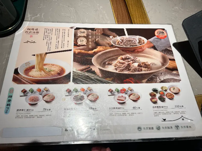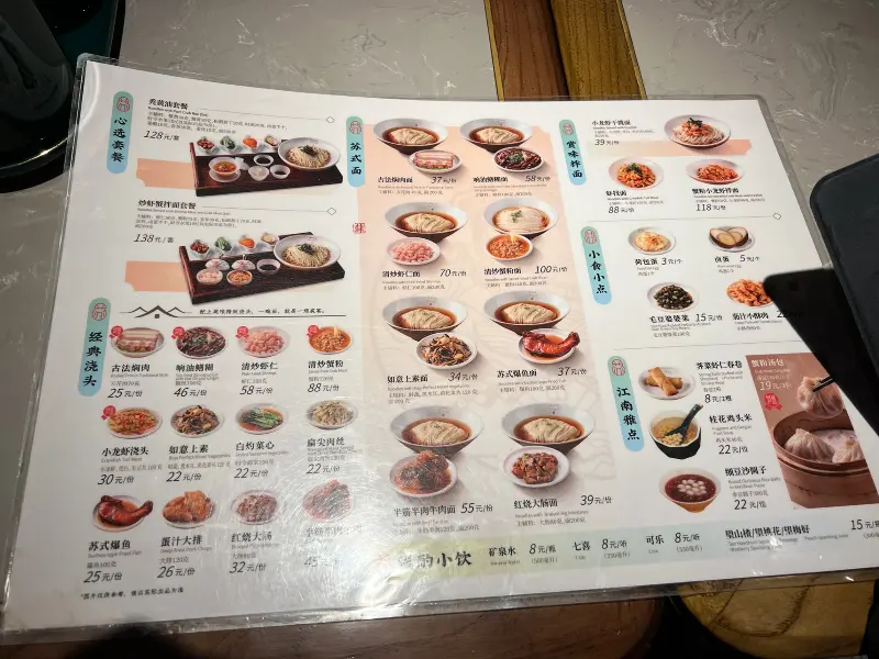 자리에 앉아 메뉴판을 펼쳐 들었다. 다양한 종류의 국수와 요리들이 눈길을 사로잡았다. 쑤저우식 국수, 게알 국수, 그리고 HK01에서 추천한 장난면까지, 무엇을 골라야 할지 고민이 되었다. 메뉴판에는 각 요리에 대한 설명과 함께 사진이 곁들여져 있어 선택에 도움을 주었다. 메뉴판 가득한 음식 사진들을 보고 있으니, 얼른 맛보고 싶은 마음이 더욱 간절해졌다.