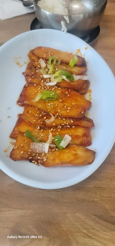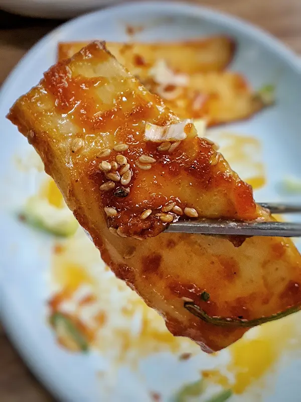 다음으로는 더덕구이를 맛볼 차례. 뜨거운 철판 위에 먹음직스럽게 구워진 더덕구이가 등장했다. 겉은 살짝 노릇하게 구워져 있고, 속은 촉촉한 찜의 느낌이다. 젓가락으로 조심스럽게 집어 맛보니, 향긋한 더덕 향이 입안 가득 퍼진다. 더덕 특유의 쌉싸름한 맛은 덜하고, 부드러운 식감과 은은한 단맛이 돋보인다.