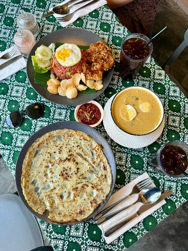 또 다른 아침, 전통 나시 르막을 맛보기 위해 오마레를 방문했습니다. 나시 르막은 코코넛 밀크로 지은 밥과 멸치, 땅콩, 오이, 삼발 소스를 함께 먹는 말레이시아의 대표적인 아침 식사입니다. 오마레의 나시 르막은 양도 푸짐했고, 신선한 재료들의 조화가 훌륭했습니다. 특히, 삼발 소스는 매콤하면서도 달콤한 맛이 일품이었죠.