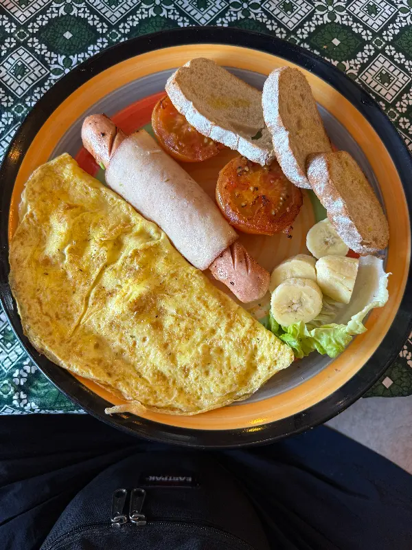 다른 날 아침, 다시 오마레를 찾았습니다. 이번에는 아침 식사를 즐기기 위해서였죠. 카야 토스트와 아침 세트 메뉴를 주문했습니다. 카야 토스트는 달콤하고 부드러운 맛이 일품이었고, 아침 세트 메뉴에 함께 나온 치킨 소시지와 구운 토마토는 정말 맛있었습니다. 특히, 카야 토스트는 겉은 바삭하고 속은 촉촉한 완벽한 조화를 이루었습니다.