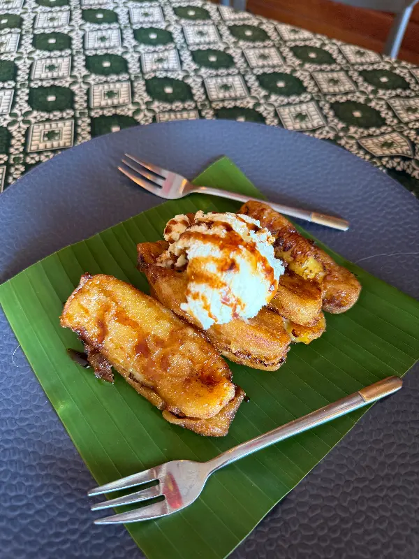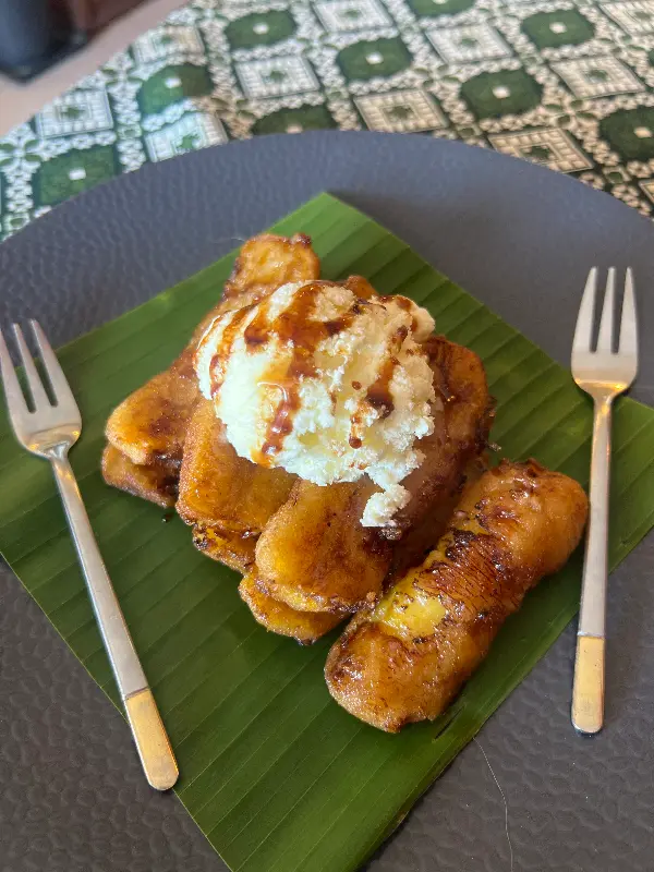 메뉴판을 펼쳐보니 나시 르막, 나시고렝 같은 현지 메뉴부터 서양식 아침 식사까지 다채로운 선택지가 있었습니다. 잠시 고민 끝에 에피타이저와 망고 스무디, 그리고 지인들의 강력 추천 메뉴인 스파게티를 주문했습니다. 음식이 나오기 전, 카페 곳곳을 둘러보며 사진을 찍었습니다. 테이블마다 놓인 푸릇한 잎사귀 장식이 인상적이었고, 따뜻한 조명 아래 아늑한 분위기가 더욱 깊어지는 듯했습니다.