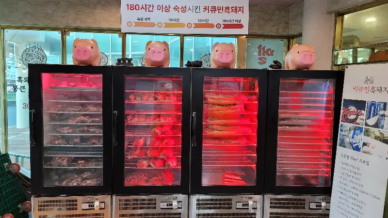 해마루커큐민흑돼지는 일반적인 흑돼지 전문점과는 차별화된 특별함을 자랑합니다. 바로 커큐민 숙성이라는 비법인데요. 180시간 이상 숙성된 커큐민 흑돼지는 돼지 특유의 잡내는 잡고, 풍미는 더욱 깊게 만들어 줍니다. 가게 입구에 들어서자마자 보이는 숙성고에는 앙증맞은 돼지 모형들이 줄지어 서있고, 그 아래 칸칸이 채워진 흑돼지의 모습은 보기만 해도 군침이 돕니다. 숙성고 안에서 은은하게 빛나는 붉은 조명은 흑돼지의 색깔을 더욱 먹음직스럽게 만들어줍니다.