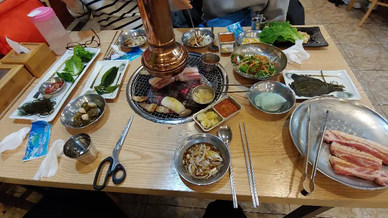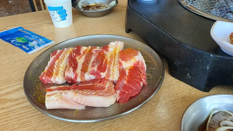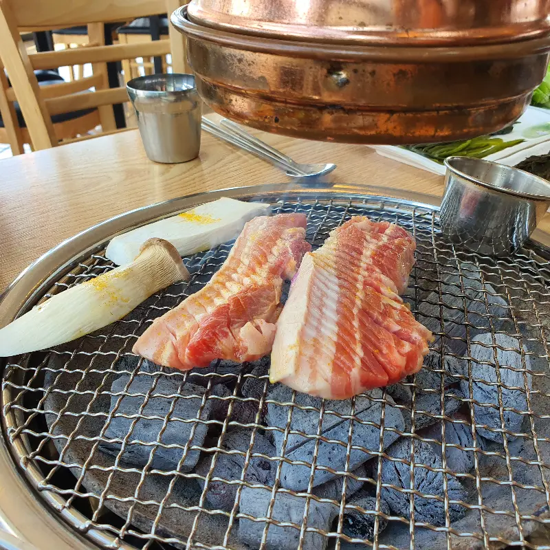메뉴판을 정독한 끝에 선택한 메뉴는 커플 모듬 세트. 흑돼지 오겹살, 목살, 그리고 전복과 새우까지 푸짐하게 즐길 수 있는 구성입니다. 특히, 큼지막한 전복과 새우는 2인 기준 각각 2개씩 제공되어 싸우지 않고(?) 사이좋게 나눠 먹을 수 있습니다. 테이블에 놓인 숯불 위로 고기가 올려지는 순간, 지글거리는 소리와 함께 코를 자극하는 향긋한 냄새가 식욕을 자극합니다.