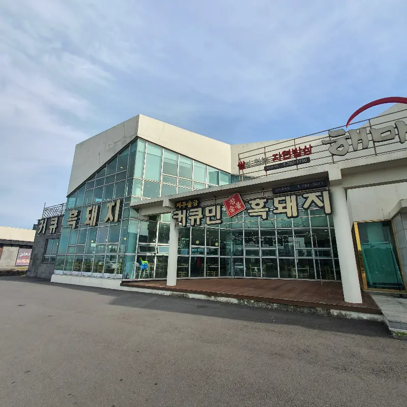 멀리서도 눈에 띄는 해마루커큐민흑돼지의 웅장한 외관. 제주 여행의 기대감을 한층 더 끌어올립니다.