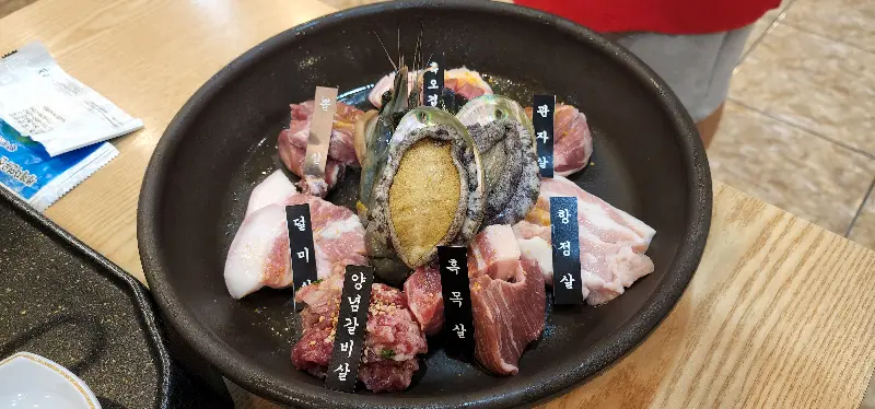 함께 제공되는 전복과 새우. 흑돼지 못지않은 훌륭한 맛을 자랑합니다.