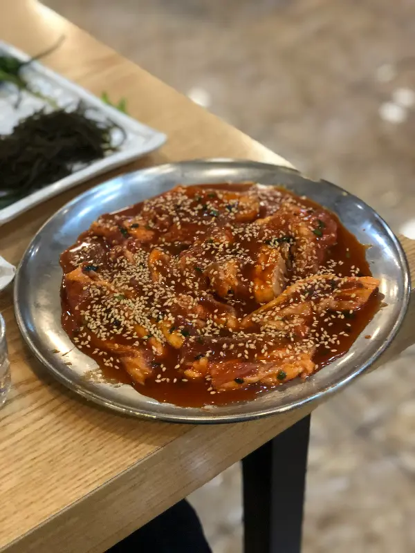 잘 익은 흑돼지 한 점을 멜젓에 푹 찍어 입안에 넣으니, 입 안 가득 퍼지는 육즙과 쫄깃한 식감이 환상적입니다. 멜젓 특유의 짭짤하면서도 깊은 맛은 흑돼지의 풍미를 더욱 끌어올려 줍니다. 깻잎에 싸서 먹어도, 쌈무와 함께 먹어도 꿀맛입니다.