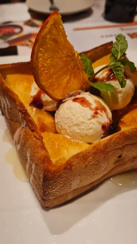 따뜻한 빵 위에 달콤한 꿀과 시원한 아이스크림이 얹어진 꿀빵은 정말 환상적인 맛이었다. 입안에서 사르르 녹는 아이스크림과 쫀득한 빵의 조화는 잊을 수 없는 달콤한 경험을 선사했다. 오렌지 조각과 민트 잎은 꿀빵의 달콤함을 더욱 풍성하게 만들어주었다.