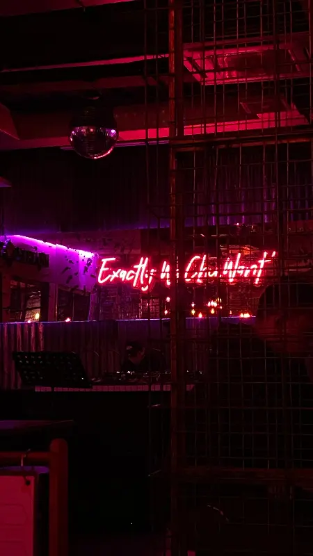 “Exactly Wa Chu Want”라는 네온 문구가 눈길을 사로잡는다. 철제 구조물과 붉은 조명, 그리고 미러볼까지, 90년대 감성을 제대로 담아낸 공간이었다. DJ 부스에서는 신나는 음악이 흘러나오고, 사람들은 음악에 맞춰 자유롭게 대화를 나누고 있었다.