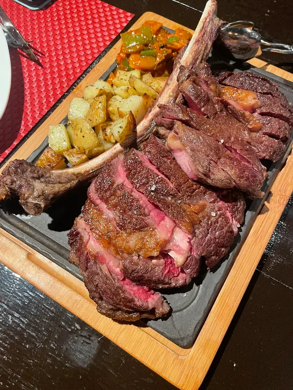 드디어 기다리고 기다리던 토마호크 스테이크가 등장했다. 거대한 뼈에 붙어있는 육즙 가득한 스테이크는 보는 것만으로도 압도적인 비주얼을 자랑했다. 셰프님이 직접 스테이크를 먹기 좋게 잘라주셨는데, 칼질 한 번에 육즙이 쏟아져 나오는 모습에 감탄을 금치 못했다. 첫 입을 입에 넣는 순간, 입안 가득 퍼지는 풍부한 육향과 촉촉한 식감은 그야말로 환상적이었다. 겉은 바삭하게 구워졌지만, 속은 촉촉함을 유지하고 있어 완벽한 굽기를 자랑했다. 곁들여 나온 구운 채소와 감자 또한 스테이크와 환상적인 조화를 이루었다.