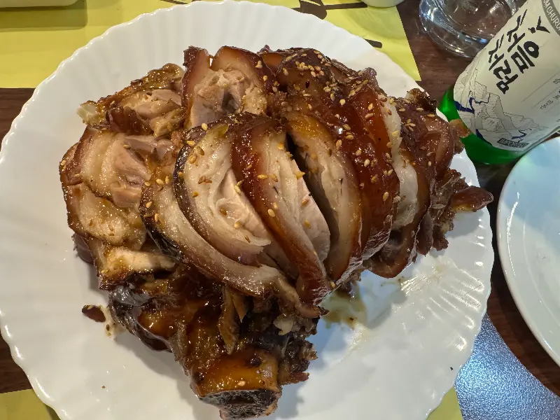 다음 메뉴는 족발이었다. 윤기가 자르르 흐르는 족발은 보기만 해도 먹음직스러웠다. 젓가락으로 족발 한 점을 집어 입에 넣으니, 쫄깃하면서도 부드러운 식감이 느껴졌다. 돼지 특유의 잡내는 전혀 나지 않고, 은은한 한방 향이 입안을 감돌았다. 곁들여 나온 신선한 상추에 쌈장을 얹어 족발을 싸 먹으니, 그 맛은 더욱 환상적이었다. 한국에서 먹었던 족발보다 훨씬 맛있다는 생각이 들었다.