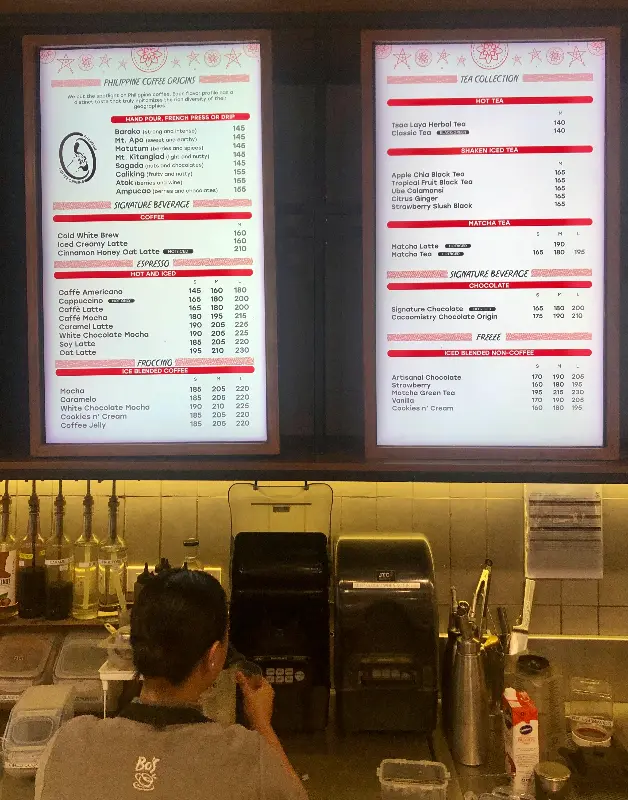 지친 일상 속에서 달콤한 휴식을 찾아 떠난 세부 여행. 낯선 도시의 활기 넘치는 거리 풍경을 감상하며 걷다 보니, 어느새 갈증과 허기가 밀려왔다. 시원한 에어컨 바람과 맛있는 커피 향이 그리워질 때쯤, 눈에 띈 곳은 바로 Bo’s Coffee 라모스 지점이었다. 야외 좌석도 마련되어 있었지만, 뜨거운 햇볕에 지친 우리는 시원한 실내를 택했다. 문을 열고 들어서니, 생각보다 많은 사람들로 북적였지만 다행히 빈자리를 찾아 앉을 수 있었다.
