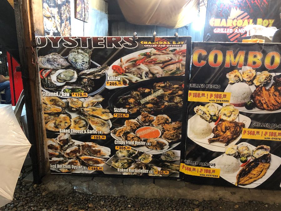 메뉴판을 자세히 살펴보니, 특히 눈에 띄는 것은 굴 요리의 압도적인 종류였다. 찐 굴과 생 굴부터 시작해, 치즈와 마늘로 구운 굴, 매콤한 칠리 토핑 굴, 그리고 록펠러 소스 굴까지, 굴 하나만으로도 이렇게 다양한 변주가 가능하다는 사실에 감탄했다. 구운 굴 요리들은 225페소라는 합리적인 가격에 제공되어, 신선한 굴을 마음껏 즐길 수 있을 것 같았다. 다른 콤보 메뉴들도 푸짐한 양에 곁들여지는 아이스티와 무제한 밥(Unli Rice)까지, 가성비 좋은 선택지로 가득했다. 이토록 굴에 진심인 곳이라면 분명 기대 이상의 맛을 선사할 것이라는 확신이 들었다.