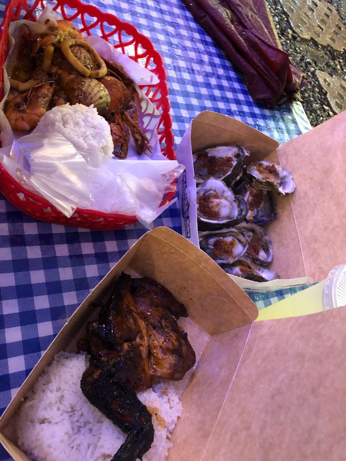 드디어 주문을 마치고 푸드코트의 활기찬 소리 속에서 음식을 기다렸다. 굴은 손질하는 데 시간이 다소 걸린다고 하여 잠시 인내심을 가져야 했지만, 신선한 재료에 대한 기대감이 그 기다림마저 즐겁게 만들었다. 이윽고 주문한 음식들이 식탁 위에 놓이는 순간, 고소하고 짭조름한 냄새가 후각을 자극하며 침샘을 폭발시켰다. 정갈하게 담겨 나온 구운 굴과 숯불 닭고기, 그리고 곁들여진 새우와 오징어 등의 해산물 콤보는 그야말로 완벽한 한 상이었다. 푸른 체크무늬 테이블보 위에 놓인 따뜻한 음식들은 보는 것만으로도 마음을 풍요롭게 했다.