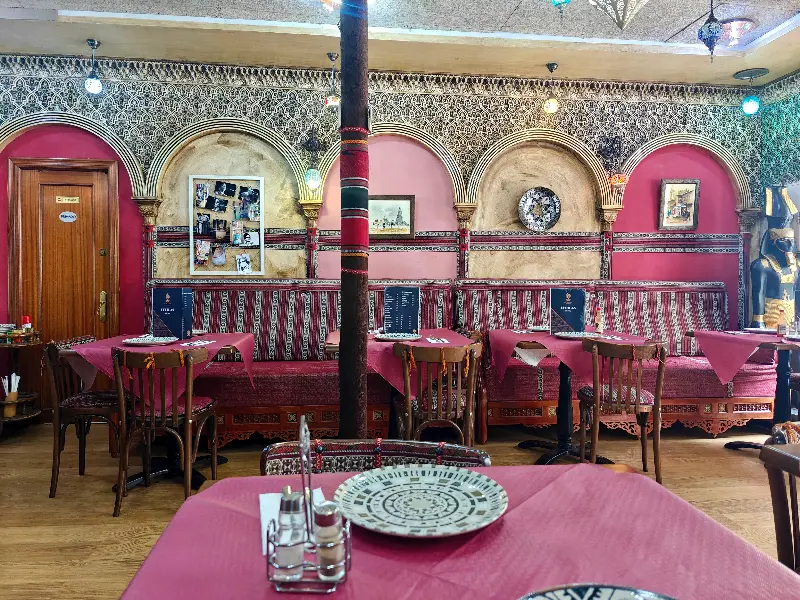 알 술탄의 내부는 마치 모로코의 어느 궁전에 와 있는 듯 화려하고 아름답습니다. 벽면을 가득 채운 섬세한 문양과 아치형 구조, 붉은색 테이블보와 쿠션이 놓인 좌석은 아늑하면서도 이국적인 분위기를 자아냅니다. 특히 눈에 띄는 것은 천장에 매달린 화려한 샹들리에입니다. 은은한 빛을 발하며 레스토랑 전체를 따뜻하게 감싸 안는 듯한 느낌을 줍니다.