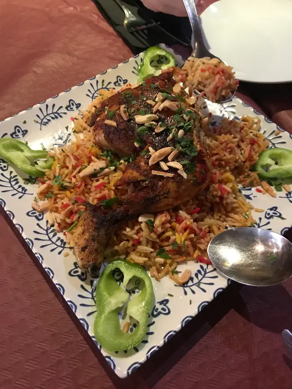윤기가 흐르는 밥과 부드러운 양고기의 조화가 돋보이는 카브사. 견과류와 허브가 풍미를 더합니다.