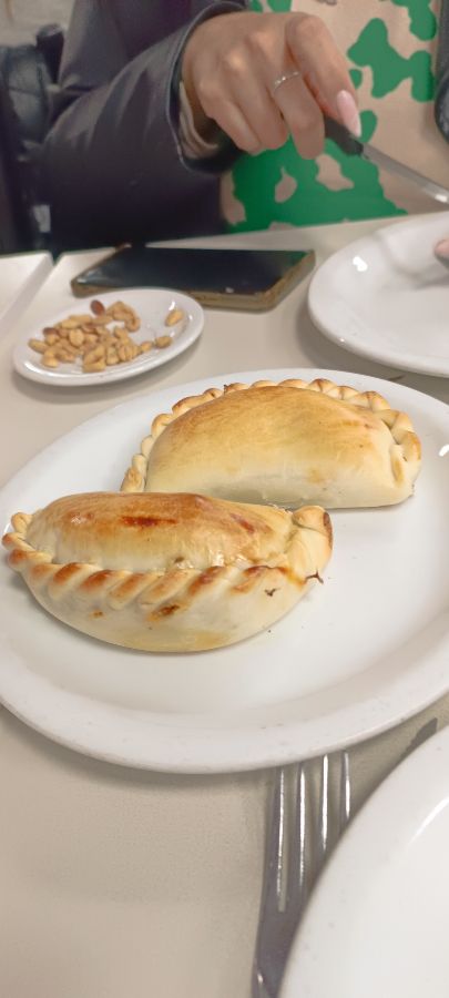 노릇하게 구워진 엠파나다 두 개가 흰 접시에 담겨 있습니다. 겉은 바삭하고 속은 촉촉할 것 같은 먹음직스러운 비주얼입니다.
