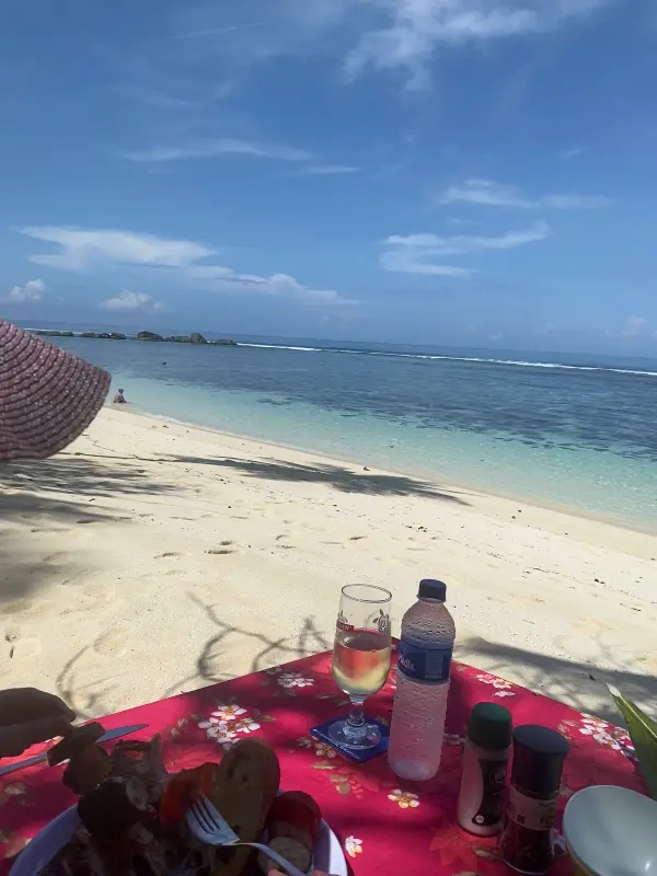 에메랄드빛 바다가 눈 앞에 펼쳐지고, 부드러운 백사장이 발 아래 감촉을 더했습니다. 스티븐은 따뜻한 미소로 우리를 맞이했고, 정성스럽게 준비된 테이블은 낭만적인 분위기를 더욱 고조시켰습니다. 붉은색 테이블보 위에 놓인 꽃 장식과 시원한 음료는 완벽한 조화를 이루었습니다. 마치 그림 속 한 장면처럼 아름다운 풍경 속에서, 우리는 곧 맛보게 될 바비큐에 대한 기대감을 감출 수 없었습니다.
