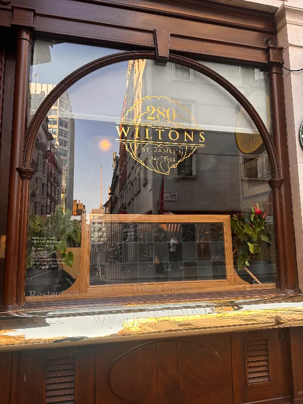 레스토랑에 도착하자, 웅장하면서도 고풍스러운 외관이 눈길을 사로잡았습니다. 황금색 글씨로 새겨진 “WILTONS RESTAURANT” 간판은 그 오랜 역사를 묵묵히 증명하는 듯했습니다. 나무로 만들어진 아치형 창문 너머로 보이는 내부의 은은한 조명은 따뜻하고 아늑한 분위기를 자아냈습니다. 윌튼스에 들어서는 순간, 마치 다른 시대의 공간으로 이동하는 듯한 착각에 빠졌습니다.