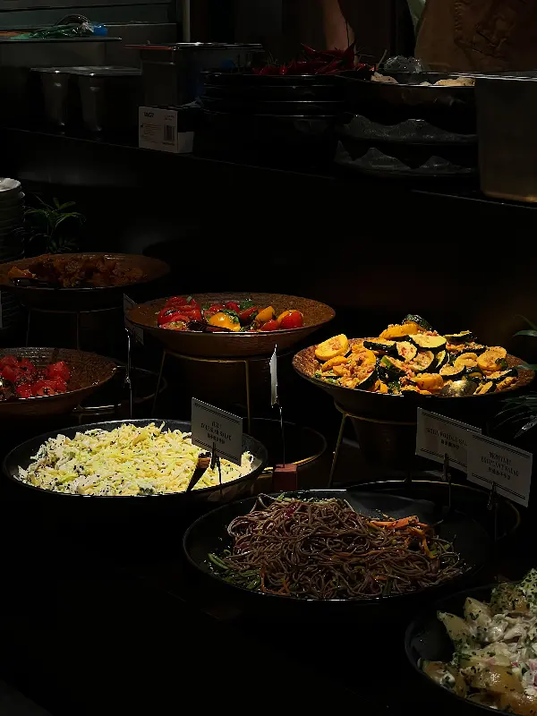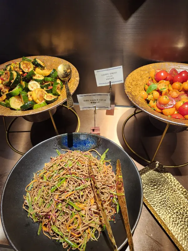 뷔페 바에는 신선한 샐러드, 롤, 튀김 등 다양한 메뉴가 준비되어 있었다. 특히, 샐러드는 신선한 채소와 다채로운 드레싱이 어우러져 입맛을 돋우기에 충분했다.