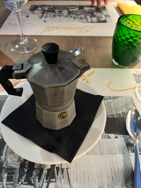 식사의 마무리는 티라미수와 이탈리아 커피로 장식했습니다. 티라미수는 부드러운 크림과 촉촉한 빵의 조화가 훌륭했으며, 커피는 이탈리아 전통 커피 포트에 담겨 나와 특별함을 더했습니다. 티라미수와 커피를 함께 즐기니, 입안 가득 행복이 퍼지는 듯했습니다.