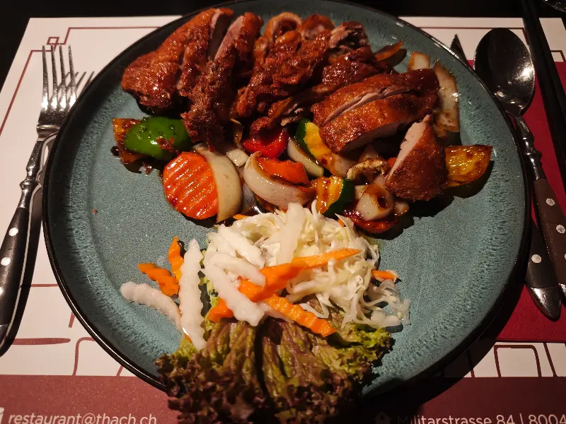 어느덧 저녁 식사 시간이 다가오고, 오늘은 어떤 특별한 음식을 맛볼까 고민하며 스마트폰을 켰다. 익숙한 듯 낯선 도시, 스위스에서 아시아의 맛을 찾아 떠나는 미식 여행. 검색 끝에 발견한 곳은 바로 Thach 레스토랑이었다. 리뷰들을 꼼꼼히 살펴보니, 친절한 서비스와 훌륭한 음식 맛은 물론, 아늑한 분위기까지 갖춘 곳이라는 평이 자자했다. 특히 구운 오리와 볶음밥에 대한 칭찬이 많아 기대감을 한껏 품고 Thach 레스토랑으로 향했다.