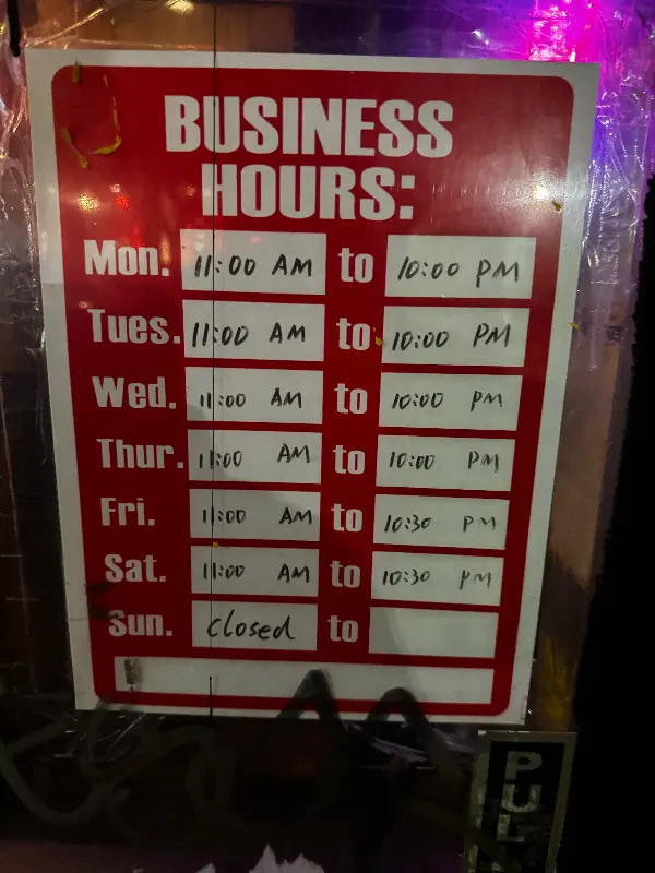 콴 스시의 영업시간 안내. 월요일부터 토요일까지 문을 열고, 일요일은 휴무다.