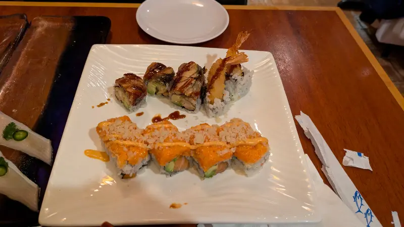 메뉴를 찬찬히 살펴보니, 다양한 종류의 스시와 롤, 사시미는 물론이고, 덮밥과 면 요리까지 준비되어 있었다. 무엇을 먹을까 고민하다가, 콴 스시의 대표 메뉴인 ‘하와이 망고 셰프 스페셜 초밥’과 ‘장어 아보카도 롤’을 주문했다. 샐러드나 수프를 선택할 수 있는 롤 2개 스페셜 메뉴는 12달러로 가격도 매우 합리적이었다.